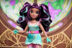 De pop draagt een roze-turquoise jurk met bloembladen, leggings met Plantmagie-motieven, bloemige laarzen en accessoires zoals haarspeldjes, handschoenen en een riem met vlinders. Met de haarstylingaccessoires creëer je talloze kapsels en verhalen. Breid je collectie uit met andere personages en hun eenhoorns voor nog meer avonturen op het Eenhoorneiland.