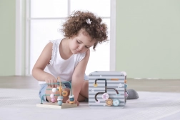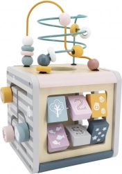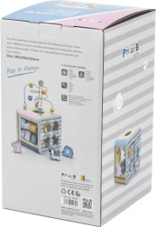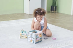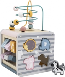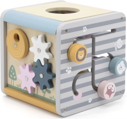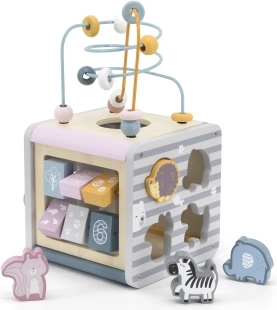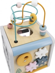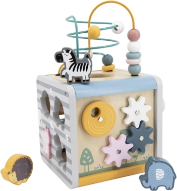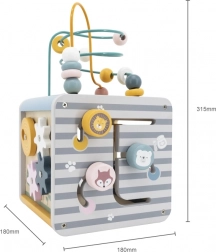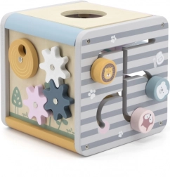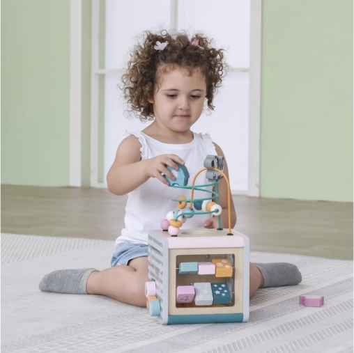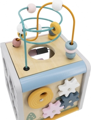 Op de bovenkant vind je een draadlabyrint met kralen voor het ontwikkelen van fijne motoriek en geduld. De zijkanten bevatten een vormensorteerder met dieren, draaibare blokjes met cijfers voor de eerste rekenoefeningen, tandwielen om oorzaak en gevolg te begrijpen en schuifelementen om coördinatie te trainen.