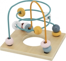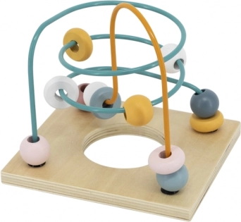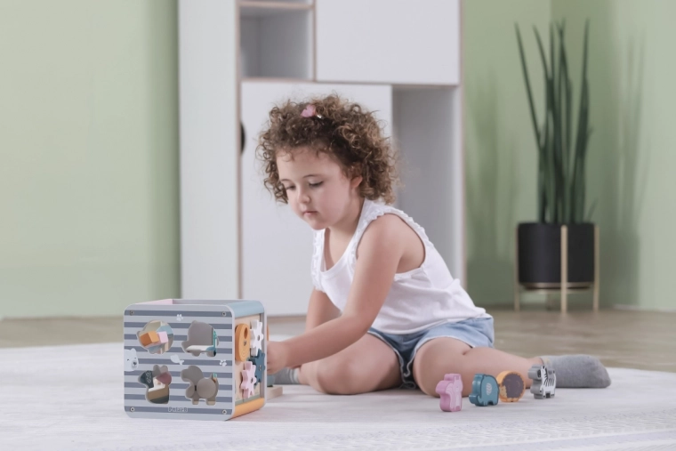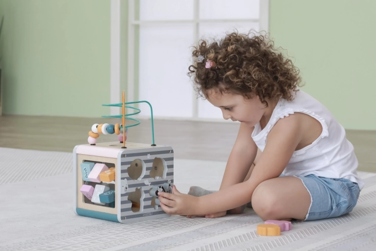 Kralenlabyrint, dieren-schuiflabyrint, tandwielen, vormensorteerder met dieren en draaibare cijferblokjes – alles voor een complete ontwikkeling.