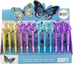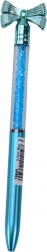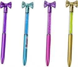 Elegante balpen met een decoratief strikje en een transparante behuizing gevuld met glinsterende kristallen geeft schrijven een unieke flair. Hij heeft blauwe inkt, een punt van 0,7 mm voor soepel schrijven en is verkrijgbaar in een mix van kleuren – paars, turquoise, roze en goud.