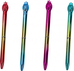 Stijlvolle balpen met een gouden lichaam en een decoratieve ananas aan het uiteinde, die elegantie en functionaliteit combineert. Schrijft met blauwe inkt met een soepele vloei en een puntbreedte van 0,7 mm, ideaal voor dagelijkse notities en als cadeau. Verkrijgbaar in goud met kleuraccenten: roze, blauw, rood, groen.