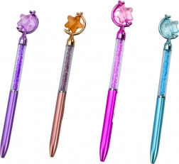 Stijlvolle balpen met een decoratieve ster en glinsterende “diamantjes” in het binnenste. Schrijft met blauwe inkt en heeft een punt van 0,7 mm voor soepel en nauwkeurig schrijven. Beschikbaar in een mix van kleuren – paars, blauw, roze en goud. Geweldig voor school, werk en als cadeau.