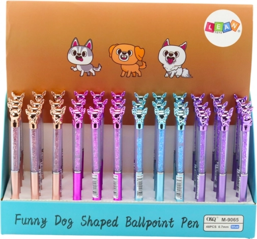 Stijlvolle balpen met een schattig hondje en een transparante behuizing gevuld met fonkelende steentjes die je notities elegantie en flair geven. Schrijft met blauwe inkt en heeft een puntdikte van 0,7 mm. Ideaal voor dagelijks gebruik of als cadeau.