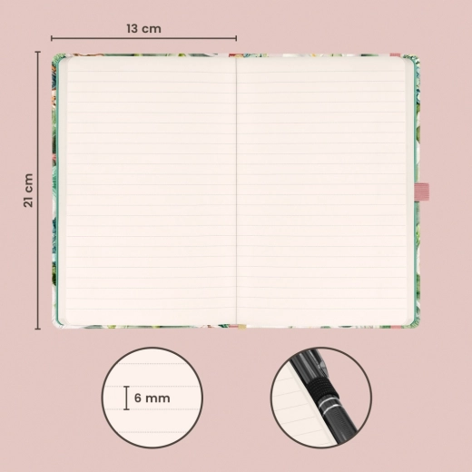 De praktische pennlus en het binnenvak voor kleinigheden komen van pas onderweg en op kantoor. Gelineerde bladzijden van zacht geel papier bieden een prettig contrast en comfortabel lezen, ook bij langer schrijven.
