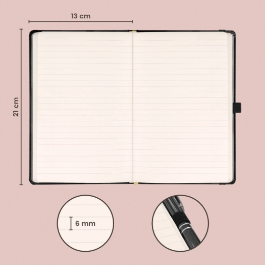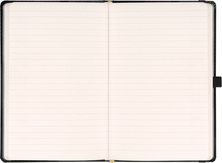 Elegant notitieboek NOTIQUE met harde kaft, elastische sluiting, pennlus en binnenvak. Biedt 172 pagina's op prettig geel papier voor al je ideeën, dagboeknotities en werknotities. Het compacte formaat van 13 × 21 cm past in tas en rugzak.