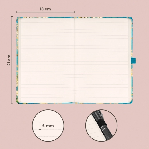 Dankzij de praktische details heb je alles bij de hand: de elastische band houdt het notitieboek veilig gesloten, de pennlus zorgt voor je schrijfwaren en het binnenvak bergt visitekaartjes of losse blaadjes op. De gelinieerde pagina’s van prettig geel papier ondersteunen overzichtelijke notities en dagboeknotities.