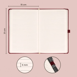 Het praktische formaat van 15 × 21 cm past makkelijk in een tas of rugzak en de elegante bordeaux kleur geeft je aantekeningen extra stijl. Het notitieboek is ideaal voor werk, school en persoonlijk plannen.