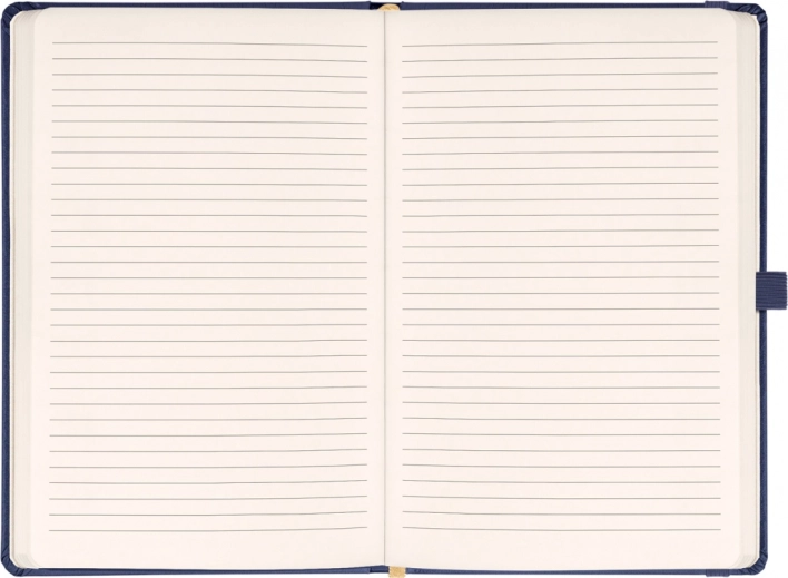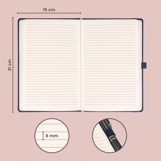 Elegant gelijnd notitieboek met afmetingen 15 × 21 cm in een donkerblauwe uitvoering. Het duurzame balacron oppervlak beschermt betrouwbaar tegen externe schade – ideaal voor werk, school en onderweg.