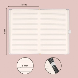 Dankzij het robuuste Balacron-materiaal is de omslag bestand tegen slijtage en dagelijks gebruik, wat een lange levensduur garandeert, zelfs bij dagelijks meenemen in een tas of rugzak. Het compacte formaat van 15 × 21 cm is praktisch voor kantoor en vergaderingen.