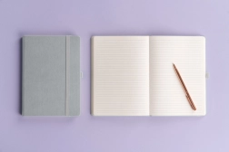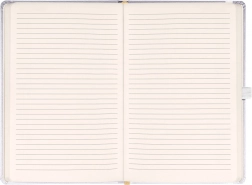 Stijlvol NOTIQUE-notitieboek met Balacron-oppervlak dat tijdloze uitstraling met hoge duurzaamheid combineert. De zilveren kleur geeft een elegante touch, terwijl het gelijnde binnenwerk het overzichtelijk noteren van aantekeningen, taken en ideeën vergemakkelijkt.