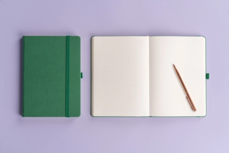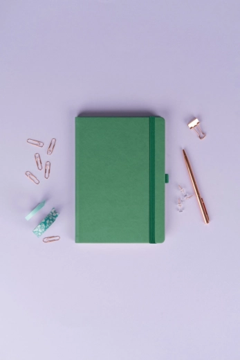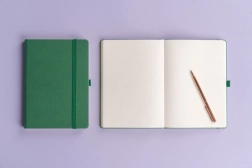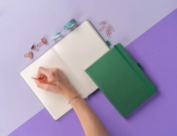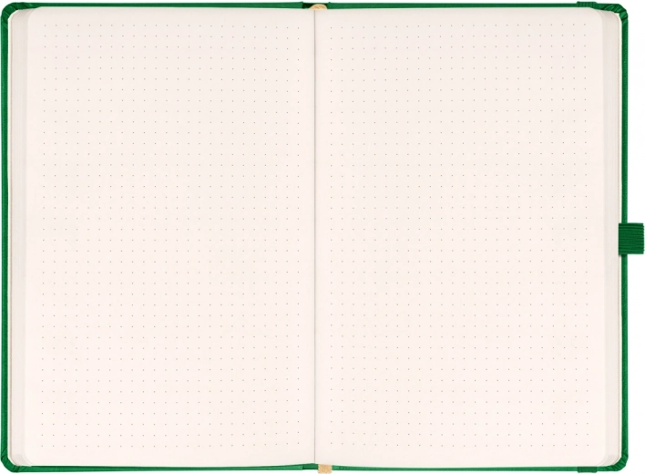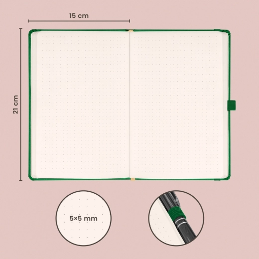 Stijlvol dotted notitieboek NOTIQUE Aprint in een elegante groene kleur, ideaal voor dagelijkse notities, planning en creatieve schetsen. Biedt een gestippeld raster voor nauwkeurig schrijven en tekenen, formaat 15 × 21 cm voor comfortabel meenemen en een oppervlak geschikt voor foliedruk van een logo met een fijne structuur.