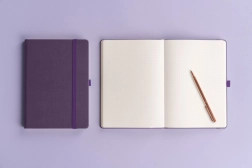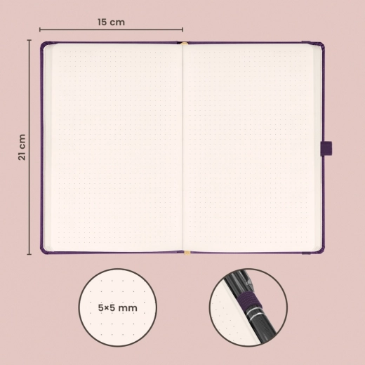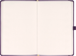 Stijlvol dotted notitieboek NOTIQUE Aprint Neo in paars combineert klassiek en elegantie. Het heeft een fijn gestructureerd oppervlak waarop eenvoudig een bedrijfslogo kan worden aangebracht, en een praktisch formaat van 15 × 21 cm voor dagelijks schrijven, plannen en schetsen.