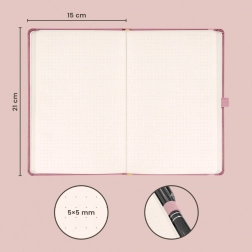 Stijlvol dotted notitieboek Notique Aprint Neo in roze, ideaal voor aantekeningen, schetsen en bullet journal. Biedt een elegant oppervlak met fijne textuur waarop eenvoudig een bedrijfslogo kan worden gedrukt (foliedruk/embossing), en een praktisch formaat van 15 × 21 cm voor dagelijks gebruik.