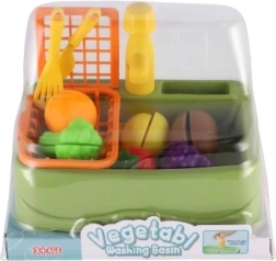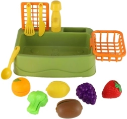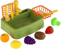 Leuke set voor in de kinderkeuken waarin kinderen het afwassen van servies en etenswaren kunnen uitproberen. Bevat een pomp-kraan, snijfruit en kleurrijke accessoires voor de ontwikkeling van fijne motoriek en fantasie. De compacte afmetingen en het duurzame plastic maken dit speelgoed ideaal voor dagelijks speelplezier.
