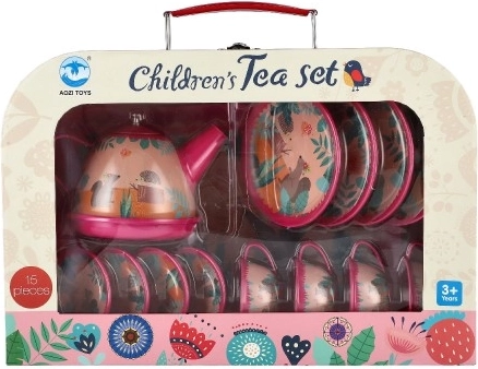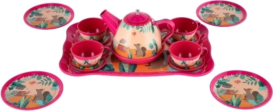 De set bevat een theepot, kopjes en schoteltjes met speelse dieren- en bloemmotieven. Kinderen kunnen vriendjes, poppen of knuffels uitnodigen en communicatie, fantasie en fijne motoriek oefenen. Geschikt voor kinderen vanaf 3 jaar.