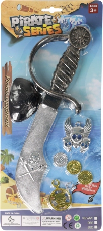 Deze piratenset maakt van elke dag een avontuur. Kinderen zullen het realistische uiterlijk van het plastic zwaard met versierd handvat en de set metallic-ogende hangers en fiches met piratenmotieven geweldig vinden. Een uitstekende keuze voor carnaval, kinderfeestjes en speelplezier thuis.