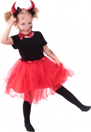 De rok heeft een elastiek in de taille voor makkelijk aantrekken en prettig draagcomfort. De set wordt aangevuld met een haarband met hoorns en een elegant strikje voor de nek, die de duivelse look compleet maken zonder extra accessoires.