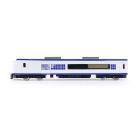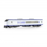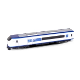 De witte uitvoering met blauwe details en strakke lijnen benadrukt de moderne uitstraling van de locomotief – ideaal om mee te spelen of om tentoon te stellen.