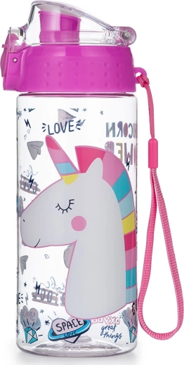 Plastic waterfles met een inhoud van 500 ml, gemaakt van hoogwaardig materiaal dat veilig is voor de gezondheid en geen BPA of ftalaten bevat.