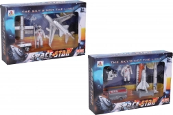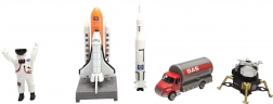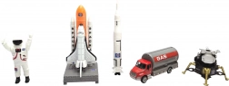 - Figur van astronaut, raket, ruimteshuttle op lanceerplatform, maanmodule, tankwagen