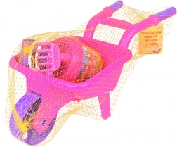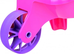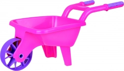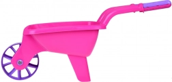 De roze kruiwagen met paars wiel is ontworpen voor kleine handjes – licht, stabiel en ideaal voor het vervoeren van zand, speelgoed of bladeren.