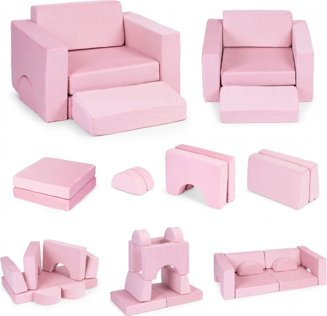 De modulaire kinderfauteuil van ECOTOYS met 8 zachte onderdelen biedt een comfortabele plek om te zitten, te ontspannen en te spelen. De lichte schuimelementen kunnen vrij worden gecombineerd tot een fauteuil, bankje, poef of matras. De hoezen zijn afneembaar met rits voor eenvoudige reiniging, de aangename stof en hoogwaardige schuim zorgen voor comfort en veiligheid. Draagvermogen 120 kg.