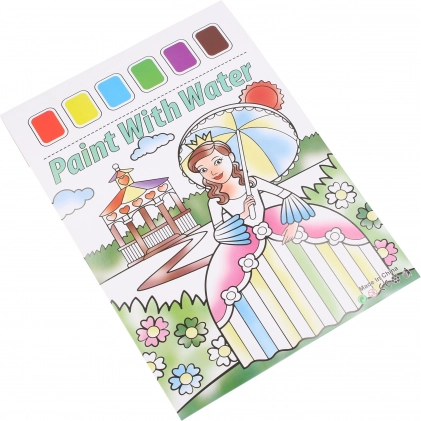 - 6 met water te activeren kleuren, 1 penseel, 6 inkleurplaten