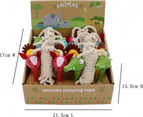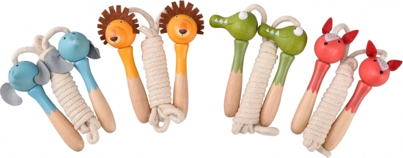 Houten springtouw met diertjes met een lengte van 210 cm en comfortabele houten handgrepen met motieven van olifant, leeuw, krokodil, vos. Geweldig plezier en training van de coördinatie voor spel buiten en binnen.