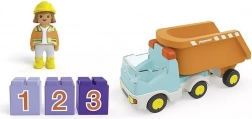 Deze kleurrijke bouwset zal kleine chauffeurs en toekomstige bouwleiders enthousiast maken. Kinderen kunnen “stenen” laden via het open achterste deel van de laadbak, de inhoud uitkiepen met de kantelbare opbouw en de leuke laad- en loscyclus telkens opnieuw herhalen. Drie genummerde blokjes (1, 2, 3) stimuleren op natuurlijke wijze de basis van het tellen en het sorteren op kleur.