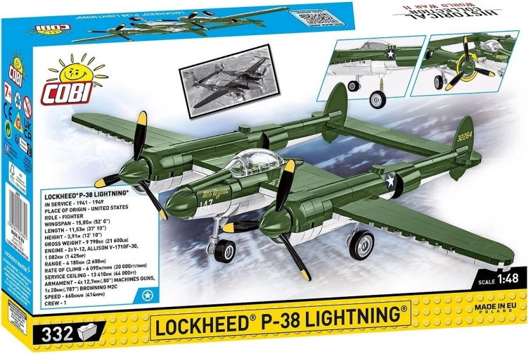 Ontdek het iconische Amerikaanse jachtvliegtuig uit de Tweede Wereldoorlog als hoogwaardige COBI-bouwset. Het model LOCKHEED P-38 Lightning op schaal 1:48 bestaat uit 332 precieze onderdelen, biedt draaiende propellers, slijtvaste prints zonder stickers en wordt in de EU geproduceerd onder licentie van Lockheed Martin. Een geweldig cadeau voor liefhebbers van luchtvaart, geschiedenis en techniek.