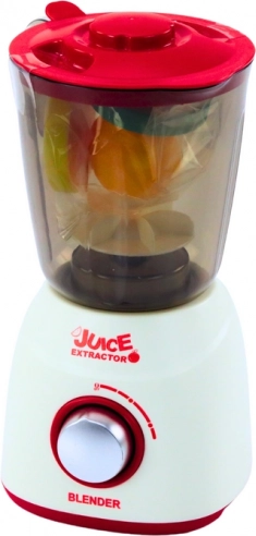 Realistische kinderblender in wit-rode uitvoering met licht- en geluidseffecten, draaiende plastic messen en 3 stuks fruit voor nog leuker keukenrollenspel. Stimuleert fijne motoriek, coördinatie en fantasie bij kinderen. Werkt op 3× AA (niet inbegrepen).