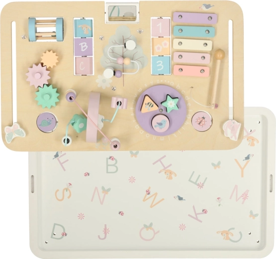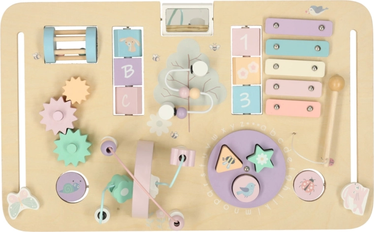 Op het blad vind je een xylofoon met stokje, een kralenlabyrint, draaibare en schuifbare elementen en een vormenstoof. Deze activiteiten bevorderen handvaardigheid, concentratie en ruimtelijk inzicht, terwijl hout en zachte kleuren rustgevend spel ondersteunen.