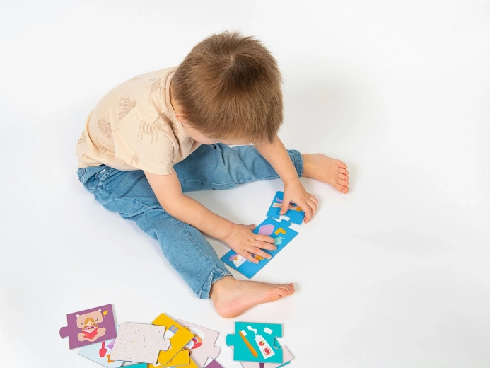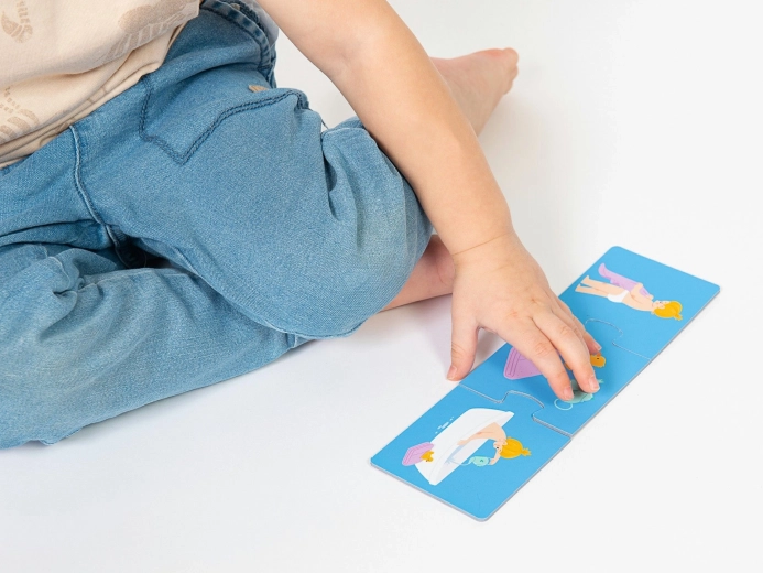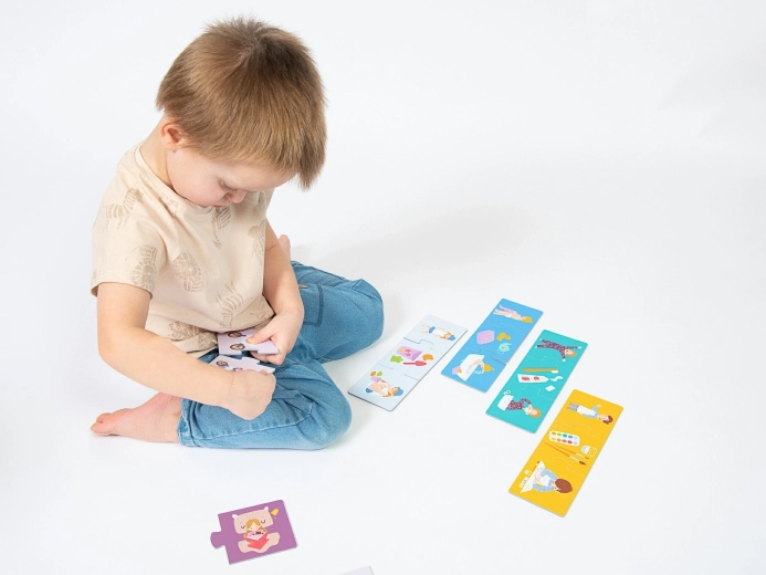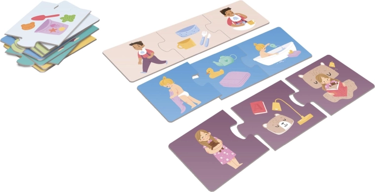 Ontdek een speelse manier om kinderen kennis te laten maken met het dagritme en alledaagse activiteiten. De set bevat 24 grote kartonnen stukken, waarmee kinderen trio’s met een gekleurde achtergrond samenstellen – kleding, hulpmiddelen en activiteit. Ontwikkelt logisch denken, woordenschat, fijne motoriek en tijdsbesef. Geschikt voor kinderen van 2–5 jaar. Gemaakt in Tsjechië.