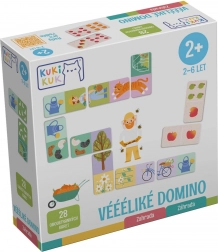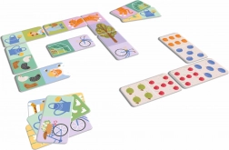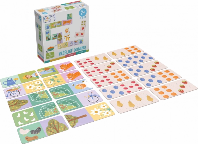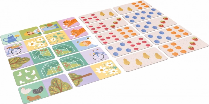 Het spel biedt twee varianten in één: afbeeldingsdomino met tuinthema (dieren, tuiniers en gereedschap) en klassiek domino, waarbij de puntjes worden vervangen door verschillende soorten fruit. Dankzij de grote, duurzame stukken van 12 × 6 cm is het spel ook geschikt voor jongere kinderen en stimuleert het leren door te spelen.
