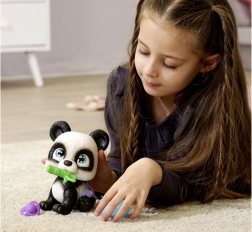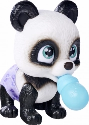 De panda drinkt water uit het bijgeleverde flesje en plast vervolgens in de luier, die geel kleurt wanneer nat, voor een authentieke speelervaring.