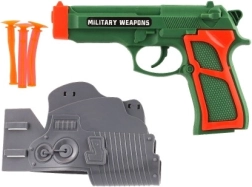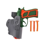 Leuk kinderpistool met zuignapkogels en holster voor veilig, actief spel binnen en buiten. In de verpakking zitten 3 pijltjes met zuignap, licht plastic ontwerp en afmeting 19 × 13 cm, geschikt vanaf 3 jaar.