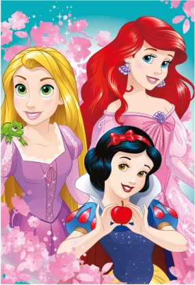 Sneeuwwitje, Ariel en Rapunzel op één kleurrijke afbeelding motiveren kinderen om te puzzelen en prikkelen hun fantasie.