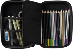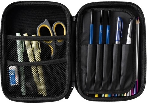 Binnenin vind je een binnenflap met 6 lussen voor potloden, pennen of stiften, 2 netvakken voor kleine spullen en een hoofdcompartiment dat plaats biedt aan een set tekenspullen of een tablet tot 8,5″. De flap beschermt tevens het scherm tegen krassen. De etui is perfect voor school, op reis en als praktische organizer voor de thuiswerkplek.