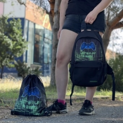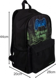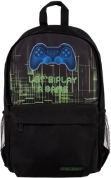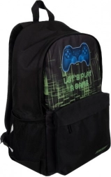 Het interieur biedt een ruim hoofdvak met een gepadding laptopvak, een voorvak met verborgen rits voor kleinigheden en twee mesh zijvakken voor een fles of paraplu. De moderne gamingprint met controller geeft de rugzak een originele look die alle gameliefhebbers zal aanspreken.