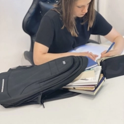 Het hoofdcompartiment met tweeweg-rits biedt plaats aan boeken, kleding en uitrusting; binnenin bevindt zich een gevoerd vak voor laptop/tablet. Het tweede compartiment is geschikt voor platte en grotere materialen (schriften, notitieblokken). Het voorvak voor kleinigheden en de twee mesh zijvakken vullen de dagelijkse organisatie perfect aan.