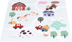 Illustraties van de boerderij met dieren, een schuur en weggetjes trekken kinderen mee in creatief spel. Heldere kleuren en gedetailleerde motieven stimuleren de fantasie en zintuiglijke waarneming.