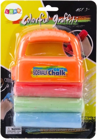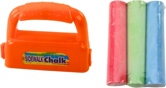 Vrolijke set stevige stoepkrijtjes met een oranje houder waarmee kinderen meerkleurige lijnen in één beweging kunnen tekenen. De krijtjes zijn gemakkelijk afwasbaar met water en de houder is licht en goed vast te houden – ideaal voor creatief buitenspel vanaf 3 jaar.