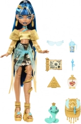 Ga op avontuur met Monster High Cleo de Nile, die de mummiemode naar een nieuw niveau tilt! Deze prachtige pop is uitgerust met elegante gouden en blauwe outfits en diverse stijlvolle accessoires die haar koninklijke uitstraling benadrukken.