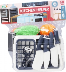 Ontdek het plezier in de keuken met deze schattige kinder keukenset! Deze set bevat niet alleen een gootsteen en afdruiprek voor realistisch spel, maar ook verschillende keukenhulpmiddelen zoals drie messen, een messenslijper en een snijplank. Daarnaast bevat de set een schiller en diverse voedingsmiddelen zoals een snijwortel, maïs en pompoen voor realistisch spel.