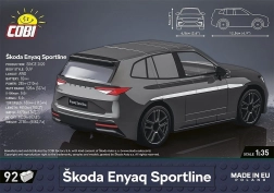 De bouwdoos Skoda Enyaq Sportline is een verkleind model in een schaal van 1:35, die de kenmerkende vormen van het originele Škoda Enyaq iV-voertuig getrouw nabootst. Het heeft draaiende wielen met banden die ideaal zijn om mee te spelen. Dit model zal niet alleen kinderen, maar ook volwassen fans van bouwdozen, verzamelaars en autoliefhebbers plezieren.