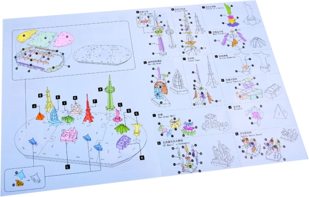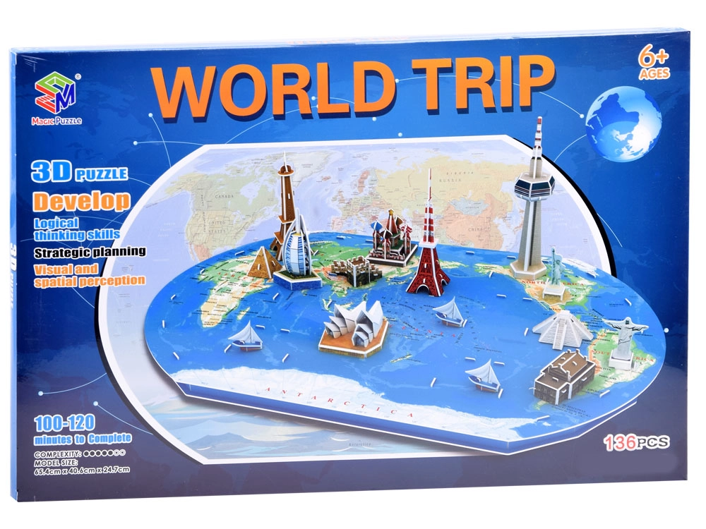 Op de kaart vind je wereldiconen zoals de Eiffeltoren, de Opera van Sydney en het Vrijheidsbeeld, en nog veel meer. Het afgewerkte model heeft afmetingen van ca. 65,4 × 40,6 × 24,7 cm en past perfect als decoratie in de kinderkamer of speelruimte.