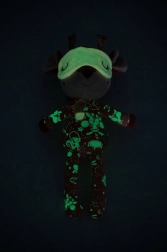 Fluorescerende prints op de pyjama en het slaapmasker lichten na het uitdoen van het licht zacht op en geven kinderen een veilig gevoel bij het inslapen.