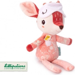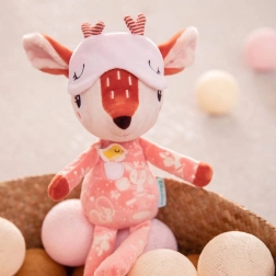 Hertje Stella in baksteenroze draagt een schattige pyjama met zakje en een vogeltje als applicatie, wat tactiele en visuele waarneming bevordert. Het slaapmasker kan over de ogen worden geschoven en licht op in het donker zodra het licht uit is, wat een gevoel van veiligheid en rust voor het slapengaan geeft. De knuffel is hoogwaardig afgewerkt, zacht en vriendelijk voor de gevoelige babyhuid.
