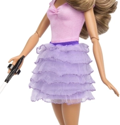 De pop draagt een roze blouse en een glanzende gelaagde rok met lila schoenen.