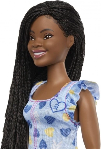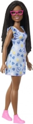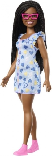 Deze modieuze BARBIE-pop brengt kinderen inspiratie om hun eigen verhalen te vertellen. Ze draagt een opvallende blauwe jurk versierd met kleurrijke hartjes, aangevuld met een roze bril en schoenen. Lange vlechten en een vrolijke uitdrukking maken haar tot de ideale vriendin voor dagelijks spelen en het stimuleren van de verbeelding.